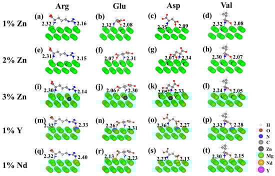 The incorporation of alloying elements not only influenced the physical and chemical properties of Mg alloys but also had a profound impact on the adsorption behavior of biomolecules on their surfaces. Among the common alloying elements, zinc (Zn), yttrium (Y), and neodymium (Nd) play distinct roles in modifying the characteristics of Mg alloys [42,43]. The effects of these elements on the adsorption of amino acids on the Mg alloy surfaces were investigated by incorporating Zn at concentrations of 1%, 2%, and 3%, alongside 1% Y and 1% Nd. The stable adsorption configurations of four kinds of amino acids on the Mg alloy surfaces with varying element concentrations are depicted in Figure 3. The Eads, calculated using Equation (1), are presented in Table 3.