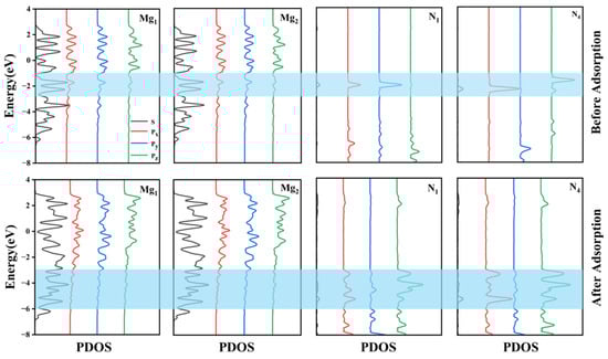 PDOS diagrams of Arg on the Mg(0001) surfaces before and after adsorption. The Fermi level was set to 0 eV.