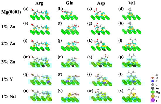 To obtain deeper insights into the bonding mechanism and charge redistribution during the adsorption process between amino acids and Mg alloy surfaces, the charge density difference (∆ρ) of the adsorption system was calculated. The results are presented in Figure 5. A positive ∆ρ (>0) indicates an increase in charge density following the interaction, whereas a negative ∆ρ (<0) signifies a decrease in charge density post-interaction. The charge density difference (∆ρ) was computed using the following formula: