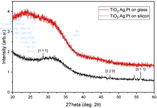 In order to determine the crystalline structure of the coating, XRD tests were carried out. Figure 1 shows the XRD patterns of the TiO2:Ag–Pt coating produced on a Si crystal and soda-lime glass via a reactive magnetron sputtering process. Analysis of the obtained diffractograms of the TiO2:Ag–Pt coating revealed the amorphous structure of the coating. No peaks from anatase, rutile, Pt, or Ag crystallites were identified in the diffractograms. Only small reflections coming from the substrate (Si crystal) are visible. However, our analysis using TEM methods, as shown in Section 2.2, confirmed that the coating, besides having an amorphous structure, consisted of crystallites of anatase, rutile, Pt, and Ag. Nanoparticles with sizes below 2–3 nm may not produce reflections in XRD patterns. The literature confirms that small crystal clusters are not detectable by XRD due to the lack of long-range order [25].