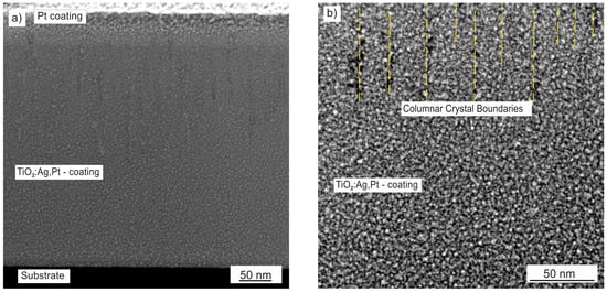 In order to determine the thickness, structure, and phase composition of the TiO2:Ag–Pt coating, TEM tests were carried out. Figure 2 shows an HAADF STEM image of a cross-section of the TiO2:Ag–Pt coating. Thanks to the HAADF detector, we set the image contrast depending on atomic number Z of the elements, i.e., the higher the value of Z, the brighter the area. At the top of the image in Figure 2a, a Pt coating deposited in the process of preparing the thinned lamella using the FIB technique is visible. The structure of the coating comprised columnar crystals with a width of 30 to 50 nm, characteristic of production via the magnetron sputtering process. The columnar crystals crystallized in a direction perpendicular to the substrate and consisted of crystallites with different orientations, as revealed by HRTEM images (Figure 6). The coating deposited on Si had a thickness of 400 nm, and on glass 600 nm.