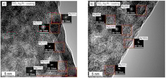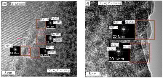 In order to identify the crystallites that formed the TiO2:Ag–Pt coating and determine their sizes, HRTEM imaging was performed (Figure 6). HRTEM images revealed the crystalline structure of the coating. Fourier transform was performed on the areas marked with a red square. Then, the distances between the atomic planes were calculated (Figure 6). Based on the determined distances, crystallites were identified. Crystallites of anatase A(101), A(103), rutile R(101), R(200), R(111), (R(210), Ag(111), Ag(200) and Pt(111), and Pt(200) were identified in the TiO2:Ag–Pt coating deposited on Si. However, in the TiO2:Ag–Pt coating deposited on glass, crystallites of anatase A(101), A(103), A(112), rutile R(101), R(200), Ag(111), and Pt(111) were observed. The crystallite size did not exceed 3 nm. HRTEM images mainly show agglomerates of the same and different crystallites.