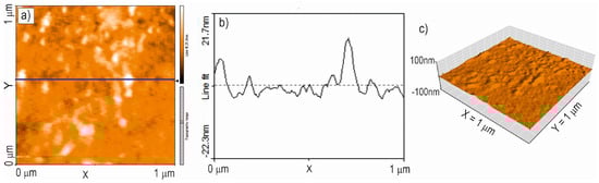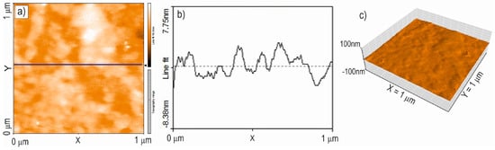 Figure 8. 2D (a), 3D (c) map and profile (b) of the surface of the TiO2:Ag–Pt coating on Si, RMS = 2.6 ± 0.3 nm (AFM).