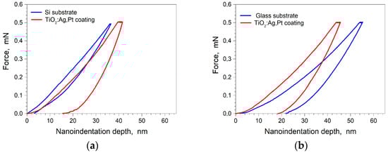 Figure 10. Indenter loads as a function of the indentation depth for the TiO2:Ag–Pt coating and the substrate: (a) Si, (b) glass.