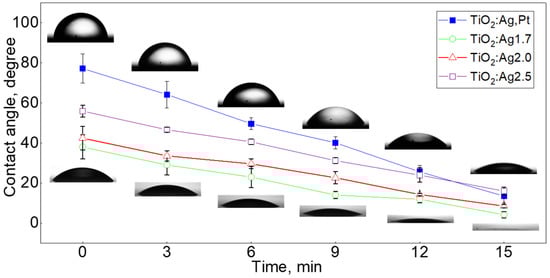The following coatings were tested: TiO2Ag–Pt on glass, TiO2:Ag–Pt on Si, TiO2:Ag1.7 on glass, TiO2:Ag2.0 on glass, and TiO2:Ag2.5 on glass. Water contact angle tests showed that the TiO2:Ag–Pt coating was characterized by hydrophilic properties. After being sprinkled with water, the TiO2:Ag–Pt coating had a contact angle of 77.2 ± 7.3° (Figure 11). After 3, 6, 9, 12, and 15 min, the angle decreased to 64.2 ± 6.7°, 49.6 ± 2.9°, 40.1 ± 3.1°, 25.6 ± 3.2°, and 13.5 ± 3.4°, respectively. For comparison, the authors also analyzed the wettability of TiO2:Ag coatings. The tests showed that TiO2:Ag coatings had a contact angle smaller than the TiO2:Ag–Pt coatings. It was observed that with an increase in the concentration Ag in the TiO2:Ag coating from 1.7 to 2.5% at., the contact angle increased. The TiO2:Ag coating with a Ag concentration of 1.7, 2.0 and 2.5% at. had a contact angle of 38.0 ± 6.0°, 42.4 ± 5.8°, and 55.9 ± 3.0°, respectively. After 15 min, the contact angle decreased for all TiO2:Ag coatings. By increasing the Ag concentration from 2.1 to 2.9% at., the contact angle also increased, as confirmed by A. Jagodzińska [29]. Mosquera [18] also confirmed that with an increase in Ag content from 0.08 to 0.28% at., the contact angle increased with TiO2:Ag coatings. This means that the coatings were less hydrophilic [18]. However, Fanming Meng et al. [4] claimed that the hydrophilic properties of a foil increased with an increase in Ag concentration up to 5% vol. Ag and then decreased [4]; this means that the water wetting angle of the films decreased as the Ag concentration increased to 5% vol. Ag and then increased. The TiO2:Ag–Pt coating contained more Ag 9.1 ± 0.2% at. and also contained Pt 5.7 ± 0.2% at. Sometimes, a higher contact angle can be explained by a higher roughness of the coating, but in this case, the TiO2:Ag coatings had an RMS roughness of 3.6–5.3 nm, while the TiO2:Ag–Pt coating had an RMS roughness of 1.8–2.6 nm. However, the presence of Pt in the coating may have changed the wetting mechanism. Undoped titanium dioxide is characterized by photoinduced superhydrophilicity of the surface. As such, it is used in the production of self-cleaning and anti-fog glass and self-cleaning coatings [30].