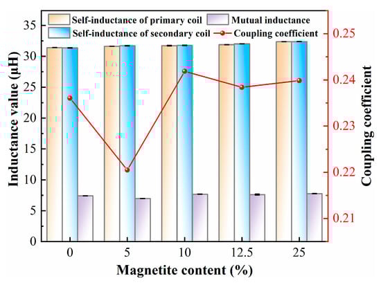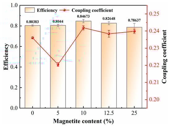 - Magnetite incorporation significantly improved magnetic coupling properties, with the coupling coefficient peaking at 0.242 at 10% content and efficiency reaching 84.67%. Beyond this threshold, efficiency declined due to escalating eddy current and hysteresis losses, defining 5–10% as the optimal magnetite dosage range. Incorporating magnetite significantly enhances coupling efficiency by improving permeability, evidenced by an increased magnetic flux density modulus in secondary coil gaps. In contrast, conventional asphalt (0% magnetite) exhibits air-core system characteristics with dispersed flux paths and poor coupling due to low-permeability media. These findings demonstrate that strategic magnetite integration effectively concentrates magnetic flux transmission, overcoming the limitations of air-dominated systems. The research prioritizes permeability enhancement through material modification as the key pathway for sustainable electromagnetic pavement system development.