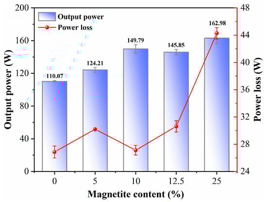 - The output power and power loss in the WPT system exhibited a nonlinear dependence on magnetite content. Output power increased with magnetite content, with the most rapid power gain at 10% content. The equivalent permeability of magnetite-modified asphalt mixtures increases with magnetite content, enhancing magnetic field intensity and output power in wireless power transfer systems. However, at 25% magnetite content, magnetic flux within the effective coupling region decreases, while the minimum flux density modulus rises significantly, indicating flux dispersion into non-effective regions. Concurrently, hysteresis and eddy current losses escalate substantially. These results identify 10% as the critical magnetite content threshold, highlighting the need for optimized material composition to balance electromagnetic efficiency and energy dissipation.