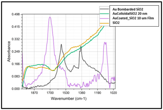 Comparison of ATR FTIR spectra of Au bombardment on SiO2, Au colloidal 20 nm on SiO2, 10 nm Au film on SiO2, and SiO2.