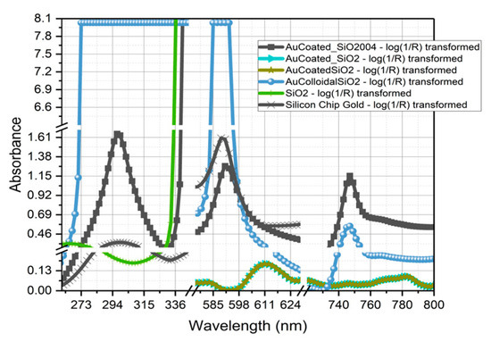 The Au-coated SiO2 sample in Figure 1, displays peaks similar to those seen in the ion-bombarded Au sample but at slightly different positions. This difference may result from variations in the method of Au deposition, affecting the local environment and the interaction strength of the modes [17]. The 20 nm Au colloidal sample in the UV-Vis spectra shows the largest and most saturated SPR peaks, indicating strong plasmonic activity. However, this strong plasmonic activity does not translate into the vibrational coupling observed in the FTIR spectrum. This suggests that while colloidal Au exhibits significant plasmonic resonance, it lacks the vibrational mode coupling seen in the ion-bombarded samples [16]. The SiO2 control sample confirms that the observed peaks in the other samples are due to the presence of Au and its interaction with the SiO2 substrate [18,19].