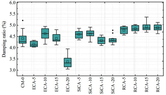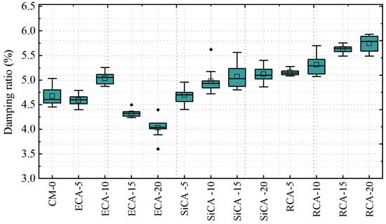 The boxplot illustrates the variability and distribution of the damping ratio for different coating materials with different replacement levels of coarse aggregate across ten repeated simulations, highlighting the median, quartiles, and potential outliers. In the boxplot, outliers are indicated by black diamond symbols.