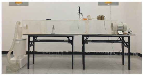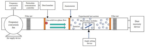 This experiment adopted the method of indoor experiments, which is more controllable compared with outdoor experiments, facilitates the repetition of experimental verification, and improves the accuracy of experimental data. In order to simulate the process of dust deposition on PV modules under natural conditions, we built a dust deposition experimental platform, which is capable of adjusting the inlet wind speed and the tilt angle of PV modules. Meanwhile, the platform has a constant temperature and humidity, which reduce the interference of environmental factors on the experimental results. The platform consists of an air supply device, a dust-blowing device, and a dust collection device, and the schematic and physical drawings of the dust deposition experimental platform are shown in Figure 1 and Figure 2, respectively. At the entrance of the platform, an inverter fan (HF-250PE, Shenzhen, China) is installed to generate a natural flow of air to carry dust into the experimental area. The experimental measurement area is a sealed rectangular air box with a volume of 0.5 m × 0.5 m × 1.0 m. In order to reduce the inhomogeneity of the inlet air velocity, the inlet and outlet of the test area are equipped with filters with uniformly densely packed circular holes. The test area is equipped with an anemometer (HT-9829, Shenzhen, China), thermometer (DM6801A, Shenzhen, China), and humidity controller (SV-202B-3, Guangzhou, China) to simultaneously measure the temperature and humidity of the test environment as well as the wind speed. A dust collector is connected to the outlet of the wind box, which can collect the dust blown out from the end of the wind box to avoid causing environmental pollution. The soot-blowing device consists of an air pump (ACO-003, Zhoushan, Zhejiang), a particulate matter reservoir, and a rubber hose, which is connected to the particulate matter reservoir and fixed to the top of the mixing zone of the airbox by means of a rubber hose. Meanwhile, the platform has a constant temperature and humidity, which reduce the interference of environmental factors on the experimental results.