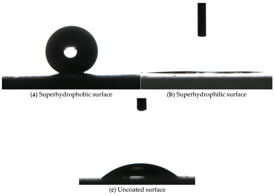 The contact angles of PV modules with different surface coatings are presented in Figure 4. The superhydrophobic coating demonstrated a contact angle of 152.3° and a surface energy of 0.25 mJ/m2, indicating extreme hydrophobicity and ultralow surface energy [37,38]. The minimal surface energy significantly weakens the adhesion between dust particles and the coating. When dust impacts the surface, kinetic energy dissipation is suppressed, promoting elastic collisions and particle rebound, thereby facilitating dust detachment from the PV module. In contrast, the superhydrophilic coating exhibited a contact angle of 3.6° and a surface energy of 72.8 mJ/m2. The high surface energy enhances dust-particle adhesion, causing rapid kinetic energy dissipation upon impact. Consequently, particle rebound is substantially diminished, often resulting in direct adsorption. While this promotes dust rolling or sliding, the strong adhesive forces lead to comparatively weaker dust deposition mitigation. The uncoated PV module is 37.9°, the surface energy is 58.3 mJ/m2, the surface energy is between superhydrophobic and superhydrophilic, the dust adhesion is moderate, the particles may partially rebound after collision, but its surface is relatively smooth, the dust particles have a large contact area with the surface, and it is easy to be piled up into a mass by gravity or wind.