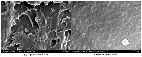 Electron microscope scanning images of different coated surfaces. (a) Surface structure of the superhydrophobic coating; (b) surface structure of the superhydrophilic coating.