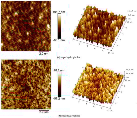 AFM images of different coated surfaces. (a) AFM morphology of superhydrophobic coated surfaces; (b) AFM morphology of superhydrophilic coated surfaces.