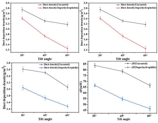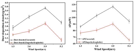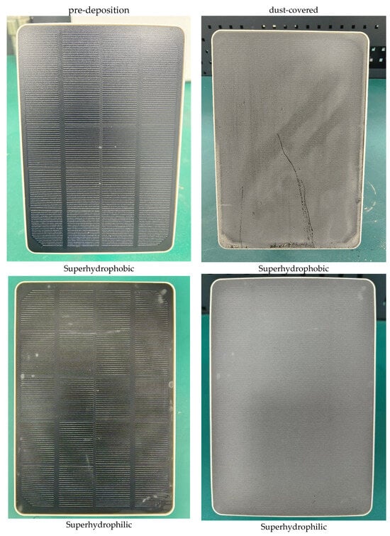 Second, we performed a comparative analysis of dust deposition characteristics on superhydrophobic and superhydrophilic coatings under varying environmental conditions. By systematically evaluating the coating performance across different wind speeds (1.3–5.2 m/s) and tilt angles (30–60°), we quantitatively assessed their relative effectiveness in dust deposition mitigation.
