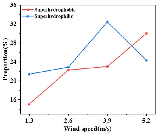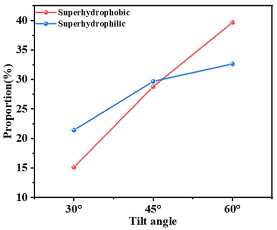 The above experimental results show that the superhydrophobic coating is more suitable for high wind speeds and large tilt angles under anhydrous conditions, mainly due to its low surface energy and non-uniform micro- and nanostructures. Under high-ind-speed conditions, the drag force of the airflow on the dust particles is enhanced, while the hydrophobic nature of the superhydrophobic coating results in a significant reduction in the contact area between the particles and the surface, and a weaker adhesion force. When the particles collide with the surface, they are more likely to rebound or roll off due to wind or gravity, especially at large tilt angles, where the gravity component further prompts the particles to detach from the surface. In contrast, the superhydrophilic coating is more suitable for low wind speeds and small tilt angles, and its rough micro-nanostructure effectively reduces the contact area of dust particles. However, as the superhydrophilic coating has a very high surface energy, resulting in a larger surface adhesion force than the superhydrophobic coating, the kinetic energy of the particles and the gravitational component force may not be sufficient to completely overcome the adhesion force as the wind speed increases or the tilt angle increases, resulting in a decrease in the dust deposition mitigation efficiency.