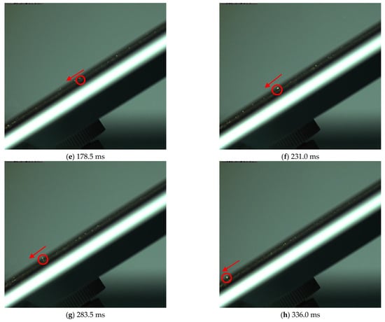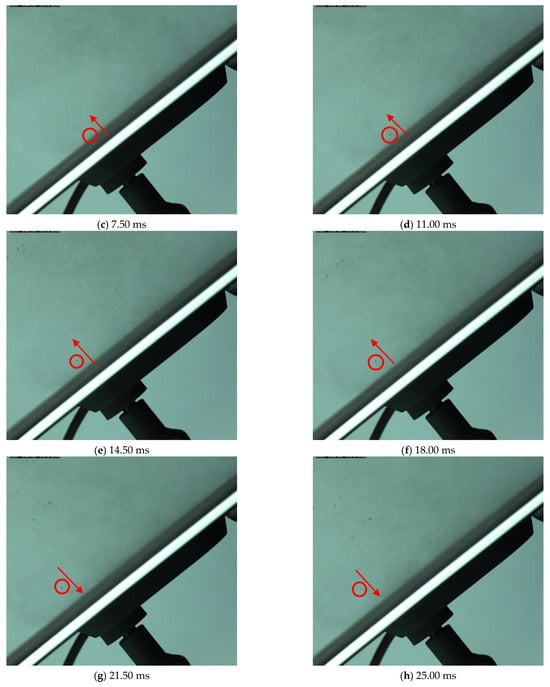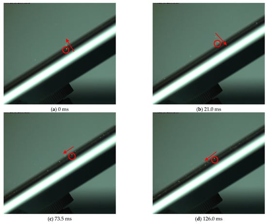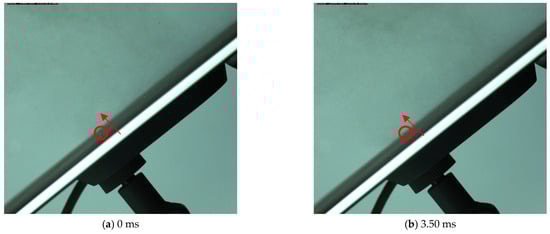 In order to further observe the dust deposition process on PV modules with different coating surfaces, we employed a high-speed camera to capture the deposition behavior of dust particles on PV modules with superhydrophobic and superhydrophilic coating surfaces, as shown in Figure 12 and Figure 13. Figure 12 illustrates the dust deposition behavior on a superhydrophobic coated PV module at a 30° inclination angle and 2.6 m/s wind speed. It can be observed from the figure that the dust particles, after making contact with the surface of the PV module, move towards the lower side of the PV module through “bouncing” behavior, and after 21.5 milliseconds (ms), rebound to reach the highest point of the whole process, and then enter the descending phase.