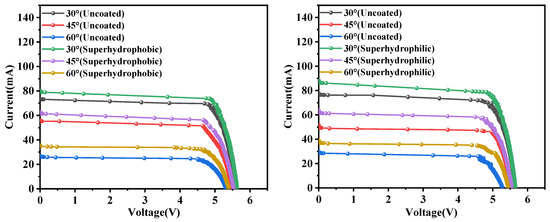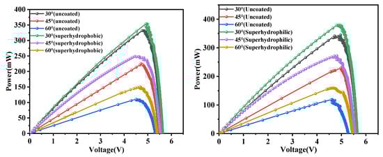 In order to systematically investigate the influence of surface coating characteristics on the output performance of PV modules, this study conducted P–V and I–V characterization tests on PV modules with different tilting angles under the condition of an inlet wind speed of 1.3 m/s, and key parameters such as the maximum output power (Pmax), the open-circuit voltage (Uoc), and the short-circuit current (Isc) were tested, as shown in Figure 14 and Figure 15. Taking the working condition of 60° as an example, the performance parameters of each module are shown in Table 2.