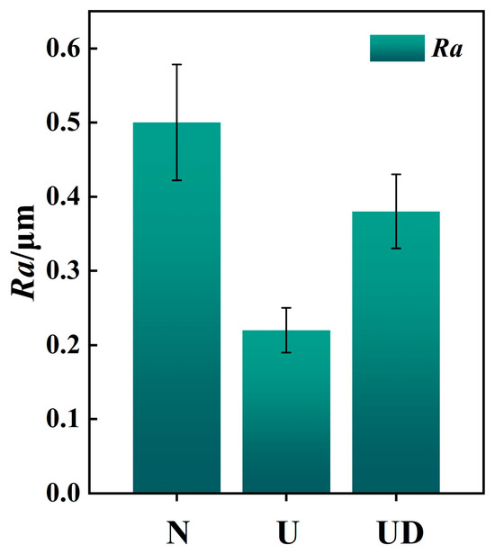 Figure 9 shows the surface hardness of N, U, and UD. Microhardness testing revealed that the surface microhardness of the N was 730 HV. During USRP, high-frequency vibrations drive the rolling tool to apply cyclic loads to the specimen surface, inducing severe plastic deformation and increasing the surface microhardness to 840 HV—an increase of approximately 15.07% compared to the N. After DLC coating deposition, the microhardness of the UD substrate reached 2252 HV.