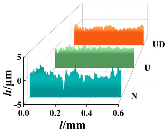 As shown in Figure 5, the micro-cutting and extrusion effects of abrasive grains during grinding result in a higher surface roughness of 0.5 μm for the N. After USRP, the surface roughness of the U decreases to 0.22 μm, representing a 56% reduction compared to N. The rolled area of the UD exhibits a surface roughness of 0.38 μm, a 24% decrease relative to N. To systematically and visually investigate the surface roughness changes among the N, U, and UD substrates, their 3D surface topographies and cross-sectional profiles are presented in Figure 6 and Figure 7, respectively.
