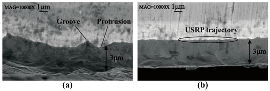 By comparing the cross-sectional SEM images (a) and (b) in Figure 8, it can be observed that at the interface between the DLC coating and the substrate, USRP smoothed the peaks and valleys on the substrate surface, reducing stress concentration at the coating–substrate interface. After depositing the DLC coating, the 3 μm-thick DLC coating became flatter due to the influence of the substrate, which can reduce stress concentration on the coating surface at the start of friction. Additionally, USRP formed micro-grooves on the substrate surface, increasing the contact area between the coating and the substrate, thereby enhancing the coating–substrate adhesion.
