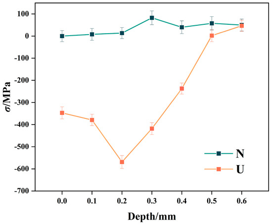 During USRP, the generation of residual compressive stress can enhance the micro-crack closure effect, effectively inhibiting the initiation and propagation of fatigue cracks. Residual stress testing on the surfaces of the specimens showed that the N had a surface residual stress of 0, the U exhibited a surface residual compressive stress of −347 MPa, and the UD had a surface residual compressive stress of −361 MPa. During DLC coating deposition, mismatches in the thermal expansion coefficients between the coating and the GCr15 bearing steel substrate induce stress deformation at the bonding interface, leading to the generation of residual compressive stress [25]. Due to project and equipment limitations, the depth-direction residual stress of UD was not measured. Future work will investigate the influence of DLC coating deposition on the depth-direction residual stress of specimens. As shown in Figure 10, the depth-direction residual stress profiles of N and U reveal that USRP introduces a residual compressive stress layer with a depth of 0.6 mm in the U, with a maximum residual compressive stress of −569 MPa. The specific mechanism is as follows: continuous impact and applied pressure from the rolling head cause plastic deformation on the substrate surface, while the subsurface layer undergoes elastic deformation. The plastic deformation of the surface layer restricts the recovery of elastic deformation in the subsurface layer, leading to the formation of a residual compressive stress distribution along the depth direction of the substrate.