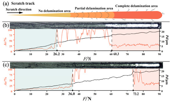 Based on the characteristics of the scratch test, the testing process was divided into three stages, as shown in Figure 11a. To effectively quantify the coating adhesion, the adhesion was defined as the average of the loads at the end of the first stage and the end of the second stage.