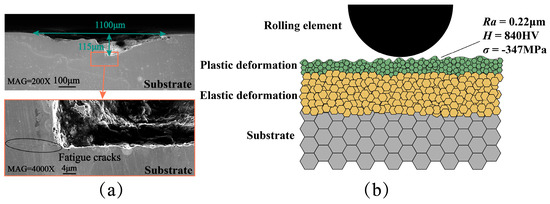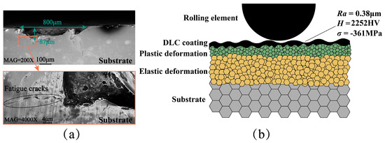 The synergistic effect at the coating–substrate interface of UD presents unique tribological behavior. Initial stage: After DLC coating deposition, the surface roughness of the specimens increased from 0.22 μm to 0.38 μm, resulting in a decrease in the actual contact area between the specimens and the rolling elements, and mild wear at the coating interface is dominant, generating small-sized wear debris. Steady stage: The sp3/sp2 hybrid bonds of the DLC coating endow it with high hardness and a low friction coefficient. During the friction process, the sp3 bonds confer excellent hardness (2252HV) and wear resistance to the coating, while the sp2 bonds significantly reduce the friction coefficient and provide moderate toughness and self-lubricating properties [27,28]. The synergistic effect of the coating–substrate gradient structure and the dynamic transfer film constructs an efficient anti-wear system [29,30]. Under cyclic loading, a graphitized transfer film is generated at the contact interface through tribochemical reactions, which can effectively reduce the friction coefficient and inhibit adhesive wear. The high-hardness (840 HV) substrate provides mechanical support for the coating to avoid cracking due to stress deformation; the high residual compressive stress (−361 MPa) on the coating surface inhibits interface delamination and enhances the bonding strength and stability. In addition, the residual compressive stress inside the substrate can effectively inhibit the initiation of subsurface fatigue cracks, further enhancing the anti-wear performance. Failure stage: Synergistic degradation of coating–substrate interface fatigue damage and gradient structure triggers complex failure. Increasing cycle counts cause local delamination of the DLC coating, exposing the USRP-treated layer. Delaminated carbon fragments and Fe3O4 particles form abrasive clusters that plow parallel grooves in the contact zone, gradually developing cracks into spalling pits. The wear form changes to a combination of oxidative wear and abrasive wear, ultimately forming a 1200 × 800 × 87 μm3 spalling pit. The sudden reduction in contact area leads to an increase in local stress, causing the experiment to stop due to excessive vibration (Figure 16).