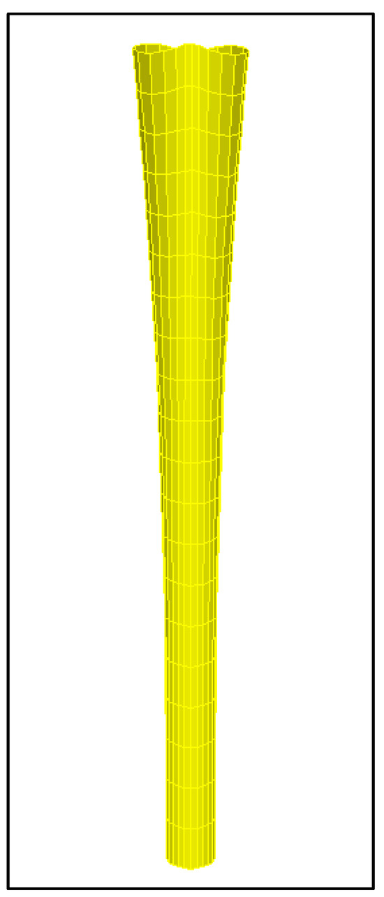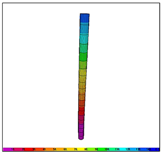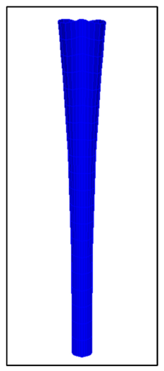 The first five frequencies of the chimney after MgO retrofitting were obtained in the range of 2.63–11.11 Hz. In Figure 10, Figure 11, Figure 12, Figure 13 and Figure 14, the first five mode shapes and frequencies of the chimney obtained from modal analyses are illustrated.
