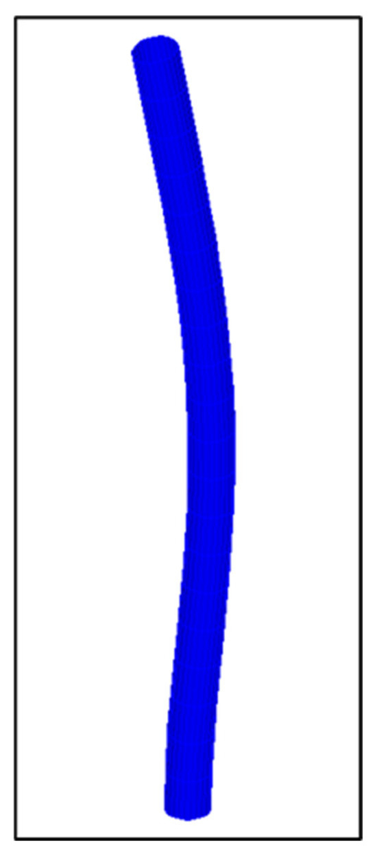 In essence, industrial chimneys are thin structures with a very homogeneous mass distribution. Thus, the higher mode effects have a significant impact on these towers’ dynamic behavior. In the time-history studies, all modes having a total modal mass participation of at least 90% were taken into account. Modal analyses were carried out to determine the frequencies and mode shapes of the chimney. The modal analysis was performed with dynamic response theories. The first five frequencies of the chimney before MgO retrofitting were obtained in the range of 2.50–7.14 Hz. In Figure 5, Figure 6, Figure 7, Figure 8 and Figure 9, the first five mode shapes and frequencies of the chimney obtained from the modal analyses are illustrated.