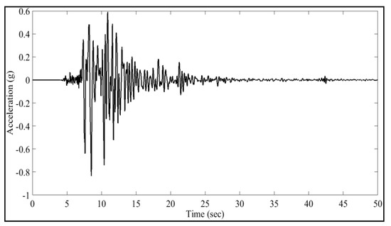 Linear transient analyses of chimney before and after MgO retrofitting were carried out using the ground acceleration values of the north–south component of the Kobe earthquake that occurred on 17 January 1995 (a total length of 50 s with equal intervals of 0.02 s). The time history of ground motion acceleration of the 1995 Kobe earthquake is given in Figure 15.