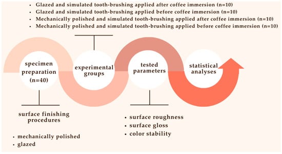 To investigate the effects of material type, application sequence, and measurement times on the surface roughness and gloss values, a three-way repeated-measures ANOVA was decided to be used. Based on a medium effect size (f = 0.25), an alpha level of 0.05, a statistical power of 0.90, and a correlation of 0.70 between repeated measures, the minimum required sample size was calculated using the G*Power v.3.1.9.4 software. The analysis indicated that a minimum of 32 specimens (n = 8 for each group) would be sufficient. To examine the effects of material type and application sequence on the color difference values, a two-way repeated-measures ANOVA was decided to be used. Under the same assumptions (medium effect size f = 0.25, alpha = 0.05, power = 0.90, and correlation = 0.70 between repeated measures), the minimum required sample size was calculated as 10 per group, totaling 40 specimens, using the G*Power v.3.1.9.4 software. Therefore, in order to evaluate the effects of material type, application sequence, and measurement time on surface roughness, gloss, and color difference values, it was decided to include 40 specimens in the study, with 10 specimens in each group. The flowchart of the study is summarized in Figure 1.