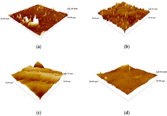 AFM images of the glazed (Figure 2a), mechanically polished (Figure 2b), glazed and tooth-brushing-applied (Figure 2c), and mechanically polished and tooth-brushing-applied (Figure 2d) specimens supported the surface roughness data. Thus, smoother surfaces were observed after tooth-brushing. Figure 2 presents the three-dimensional surface topographies obtained by atomic force microscopy (AFM) for the four experimental conditions: (a) glazed, (b) mechanically polished, (c) glazed and tooth-brushing-applied, and (d) mechanically polished and tooth-brushing-applied specimens. The maximum height variations observed in each group were 111.49 nm for the glazed group, 155.31 nm for the mechanically polished group, 116.75 nm for the glazed and brushed group, and 245.93 nm for the mechanically polished and brushed group. These values reflect surface topographical differences that are consistent with the Ra measurements.