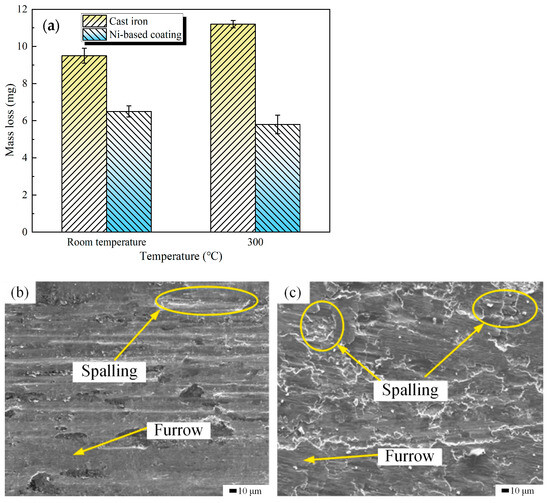 (a) Wear losses of cast iron and Ni-based coating; (b) worn surfaces of substrate at RT; (c) worn surfaces of substrate at 300 °C; (d) worn surfaces of coating at RT and (e) worn surfaces of coating at 300 °C [50].