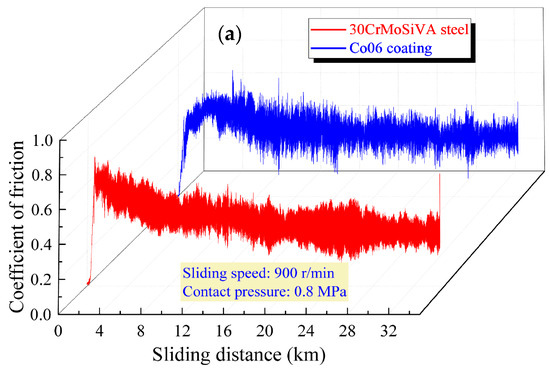 High-performance coatings on steel brake discs were prepared through laser cladding technology with Stellite 21 cobalt-based alloy powder, as reported by Zhao et al. [53]. The coating meets the operational demands of high-speed trains and contributes to extending the service life of brake discs. Liu et al. [54] employed laser cladding technology to deposit cobalt-based alloy powder onto the surface of steel brake discs. The resulting Co06 coating demonstrated remarkable wear resistance, high-temperature oxidation resistance, and excellent anti-friction properties during braking, further substantiating the effectiveness of laser cladding technology. Xiao et al. [55] successfully fabricated Co06 coating on 30CrMoSiVA steel—a material used for high-speed train brake discs—using laser cladding technology. To thoroughly evaluate the performance of this coating, an extensive analysis was conducted on the tribological properties of copper-based composites against both 30CrMoSiVA steel and the Co06 coating at temperatures ranging from 25 °C to 800 °C. As clearly shown in Figure 6, at 800 °C, the friction curves and wear morphology of the Co06 coating and 30CrMoSiVA steel display significant differences. The study revealed that Co06 coating exhibited exceptional tribological performance at high temperatures, with considerably less fluctuation in the friction curve compared to 30CrMoSiVA steel, as well as superior high-temperature wear resistance.