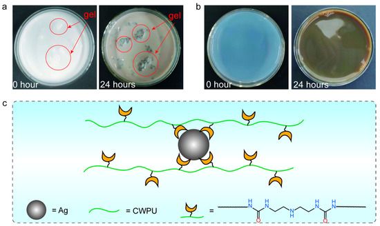 (a) WPU/Ag and (b) CWPU/Ag dispersions at different times, and (c) the complex structure between CWPU and Ag.