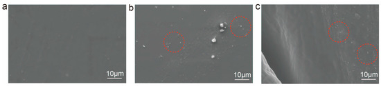 Figure 3a shows the SEM images of CWPU, CWPU/Ag films, and CWPU/Ag-coated cotton fabric. As seen in Figure 3b, the CWPU film surface smooth after film formation. Upon the addition of AgNO3, numerous regularly shaped particles were evenly dispersed on the CWPU/Ag film surface, with particle sizes smaller than 1 micron. The even dispersion of nanoparticles was essential for the film’s performance, likely because Ag+ ions first coordinate with the DETA structure in the WPU chain prior to in situ reduction by PTMEG polyether polyol in the soft segment [25]. Figure 3c presents the morphology of cotton fabric treated with CWPU/Ag. As seen in the image, Ag nanoparticles were successfully reduced on the cotton fabric surface after treatment.