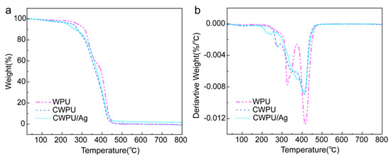 (a) TG and (b) DTG curves of WPU, CWPU, and CWPU/Ag.
