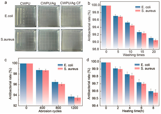 (a) Antibacterial test of CWPU films, CWPU/Ag films and CWPU/AgCF against E. coil and S. aureus, and the antibacterial rate of CWPU/Ag CF against S. aureus and E. coli after (b) washing, (c) abrasion, and (d) heating.