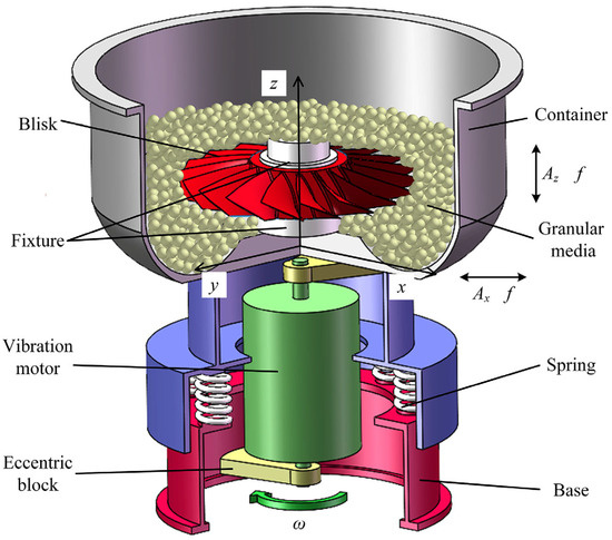 - Wang, J.; Li, X.; Li, W.; Yang, S. Research of Horizontal Vibratory Finishing for Aero-Engine Blades: Movement Characteristics and Action Behavior of Media. Int. J. Adv. Manuf. Technol. 2023, 126, 2065–2081. [Google Scholar] [CrossRef]