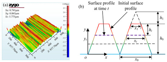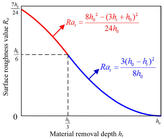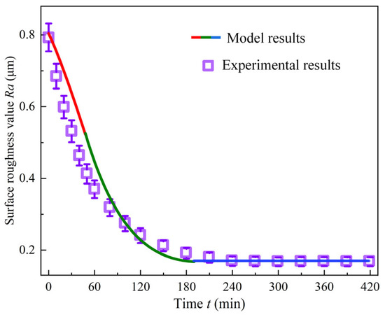 - In order to improve the accuracy of the prediction model, a simplified two-dimensional surface profile of a trapezoidal array is established based on the initial surface profile of the blisk. The machining marks caused by the granular media on the parts are the main factors affecting the machining limit of the surface roughness. A formula for the influence of scratches is introduced, and a theoretical model of surface roughness is established. The surface roughness value Ra, with the increase in the machining time, can be divided into three stages: the stage of the decreasing growth rate, the stage of decreasing at a decelerated speed, and the stable stage.