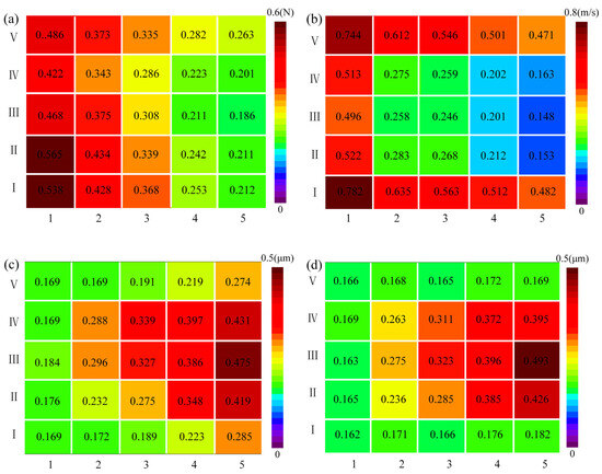 - The normal force acting on the blade tip area of the blade is greater than that on the blade root area, and the relative tangential velocity between the edge area and the granular media is greater than that in the profile area. After 100 min of machining, the model results are 0.169~0.472 μm, and the experimental results are 0.162~0.493 μm. The average error between the two is 11.8%, which further demonstrates the effectiveness of the constructed surface roughness model.