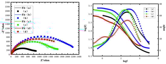 Figure 1. Ac impedance spectra of coatings obtained with four complexing agents: (a) sodium citrate/TEPA, (b) 2-pyridinecarboxaldehyde oxime, (c) 2-acetylpyridine ketoxime and (d) 2-pyridine amidoxime. (Left: Nyquist plots; right: Bode plots).