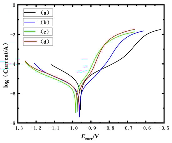 Figure 3. Tafel curves of coatings obtained with four complexing agents (The reference electrode is a ±3 mV SCE): (a) sodium citrate/TEPA, (b) 2-pyridinecarboxaldehyde oxime, (c) 2-acetylpyridine ketoxime and (d) 2-pyridine amidoxime.