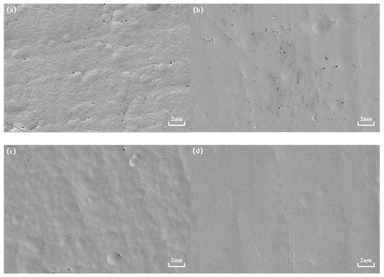 Figure 4. Surface topography of the coatings obtained by four complexing agents at a magnification of 5 k×: (a) sodium citrate/TEPA, (b) 2-pyridinecarboxaldehyde oxime, (c) 2-acetylpyridine ketoxime and (d) 2-pyridine amidoxime.