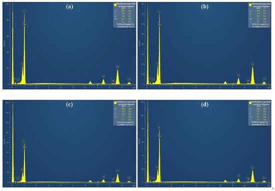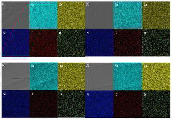 Figure 6. Elemental distribution of coatings obtained by four complexing agents: (a) sodium citrate/TEPA, (b) 2-pyridinecarboxaldehyde oxime, (c) 2-acetylpyridine ketoxime and (d) 2-pyridine amidoxime.
