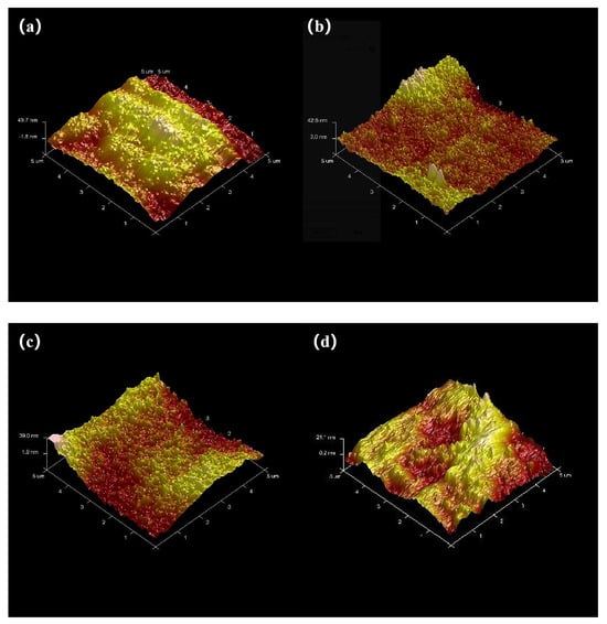 Figure 8. Atomic force microscopy morphology of coatings obtained with four complexing agents: (a) sodium citrate/TEPA, (b) 2-pyridinecarboxaldehyde oxime, (c) 2-acetylpyridine ketoxime and (d) 2-pyridine amidoxime.