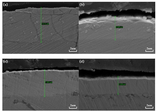 The cross-sectional SEM characterization reveals distinct morphological differences between the coatings obtained from the pyridine oxime complexants and the sodium citrate/TEPA system. The pyridine oxime-derived coatings exhibit compact morphology with coherent grain packing and minimal intergranular fissures, reflecting optimized atomic rearrangement under strong N,O-chelation conditions. In contrast, the citrate/TEPA system displays intermittent microcracks along the coating cross-section (Figure 10), indicative of stress accumulation during rapid deposition kinetics. This structural disparity aligns with the cathodic polarization data, where the oxime ligands’ superior complexation strength promotes cohesive columnar growth through controlled ion discharge, while the citrate/TEPA’s weaker coordination permits faster but less orderly metal deposition. The observed crack propagation in the citrate/TEPA coatings likely originates from hydrogen entrapment and differential shrinkage stresses, factors mitigated in oxime systems through their hydrogen evolution suppression capability, as previously discussed. These cross-sectional observations corroborate the inverse thickness–structure relationship, confirming that pyridine oximes achieve defect density reduction at the expense of deposition rate—a critical trade-off for applications requiring both corrosion resistance and mechanical durability.