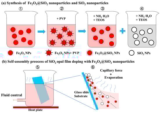 Schematic of procedures to synthesize nanoparticles and opal films: (a) schematic of procedures to synthesize Fe2O3 core–SiO2 shell structure nanoparticles (Fe2O3@SiO2 NPs) (①−③) and SiO2 nanoparticles (SiO2 NPs) (④); (b) schematic of procedures to synthesize SiO2 opal film doped with Fe2O3@SiO2 NPs (⑤, ⑥).