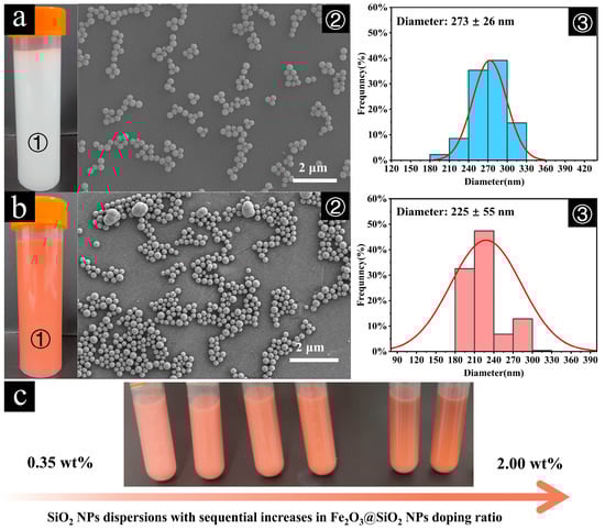 As expected, the sol–gel method produced well-dispersed SiO2 and Fe2O3@SiO2 NPs, demonstrating the positive effects of silica coating in terms of uniform doping. This effect was attributed to the surface chemistry properties of the SiO2 shells and SiO2 NPs [55]. Visual observation confirmed that the colloidal dispersions of Fe2O3@SiO2 NPs, SiO2 NPs, and their mixtures remained sufficiently stable without visible precipitation for 3 h (longer than the duration of the self-assembly experiments) at room temperature (Figure 2a—①, 2b—①; Figure 2c). The SEM analysis showed SiO2 NPs with a uniform spherical morphology, with an average diameter of 273 ± 26 nm (Figure 2a—②, ③). After the coating process, the Fe2O3@SiO2 NPs showed good monodispersity and a slight increase in particle size compared to the Fe2O3 NPs, with a mean diameter of 225 ± 55 nm (Figure 2b—②, ③). While the majority of the coated particles were monodispersed and spherical with similar dimensions, a minor fraction (2.5%) presented as near-spherical structures with larger diameters of approximately 500 nm. This size variation and large standard deviation likely resulted from the aggregation of the Fe2O3 NPs during the coating process, leading to the formation of larger particles and a broader size distribution.